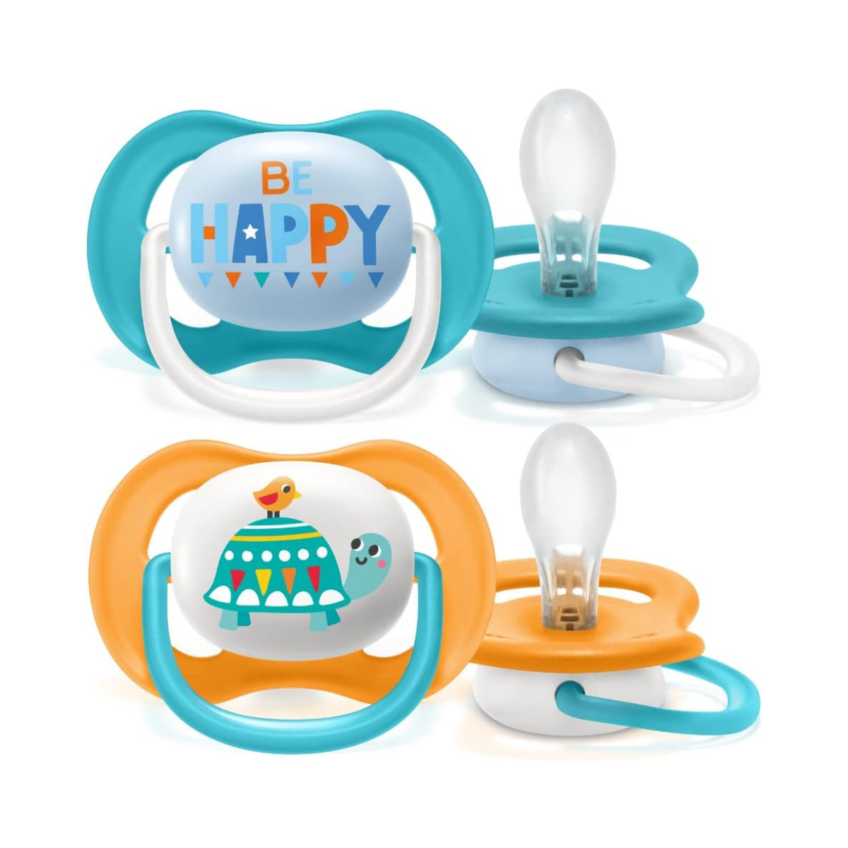 2 Chupetas Ultra Air Philips Avent, decoradas em tons de azul e laranja.