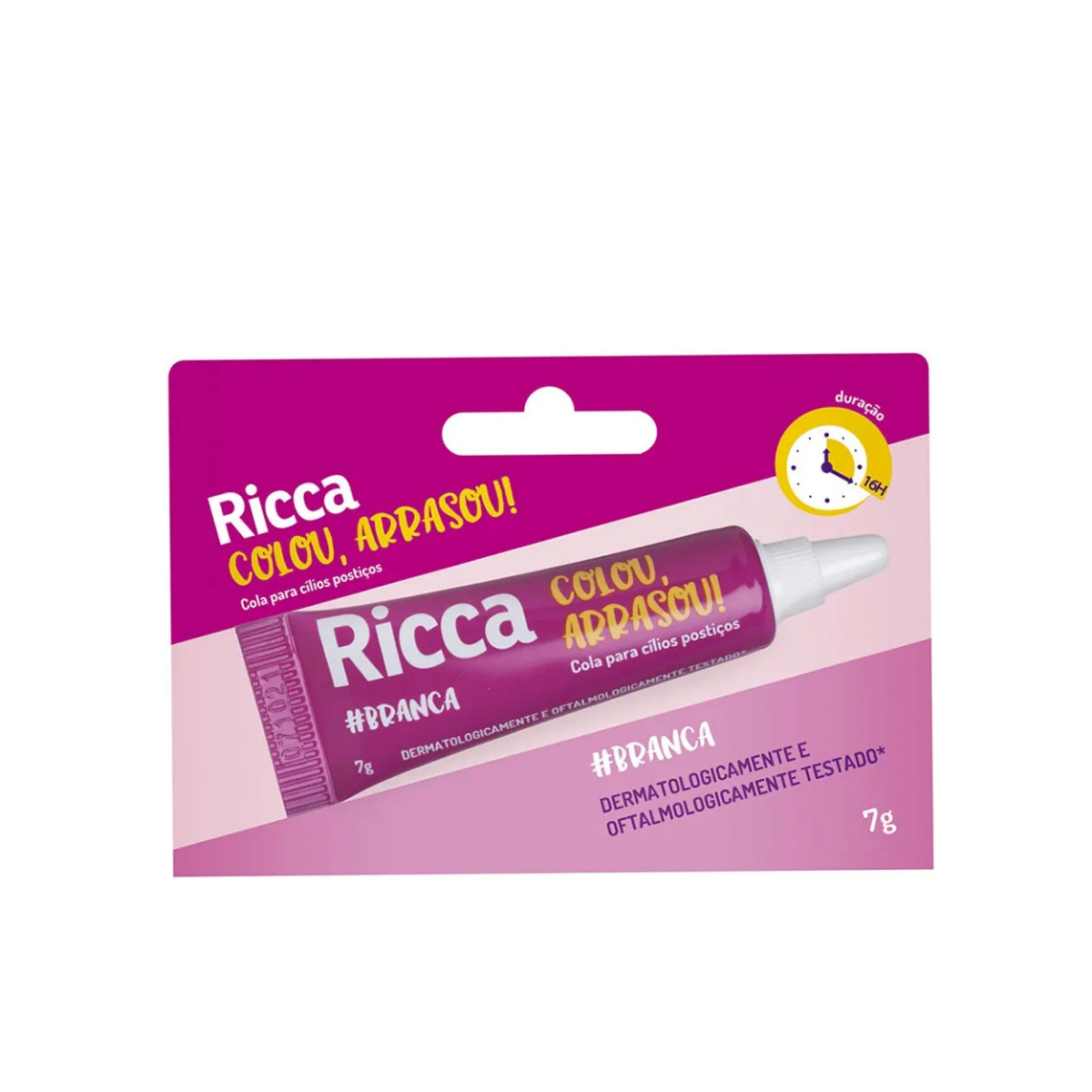 A linha de Cílios Ricca também traz a cola especial para uso de cílios, super essencial pra você usar seus cílios com segurança e um acabamento perfeito. A cola é branca mas fica transparente após a secagem deixando o acabamento ainda mais bacana, a duração é de 16 horas e você pode reaplicar caso necessário. Para fazer a remoção os demaquilantes facilitam o processo.