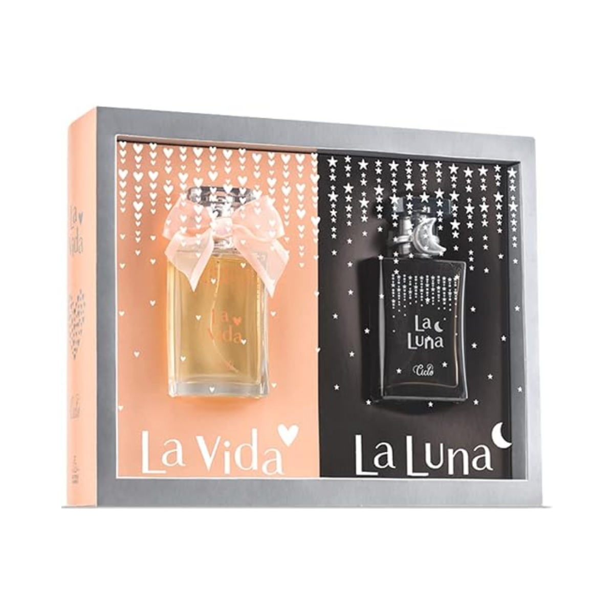 Conjunto com dois perfumes femininos Ciclo Cosméticos. La Luna + La Vida apresenta fragrâncias especiais para celebrar cada momento do dia. Conjunto La Luna + La Vida, da Ciclo Cosméticos, traz um perfume mais delicado para o dia e outro mais intenso para a noite. La Vida foi pensado para mulheres que mesclam leveza e intensidade, e traz notas gourmands, florais e frutais. Já La Luna possui fragrância oriental gourmand, despertando a sensualidade para uma misteriosa noite de luar.