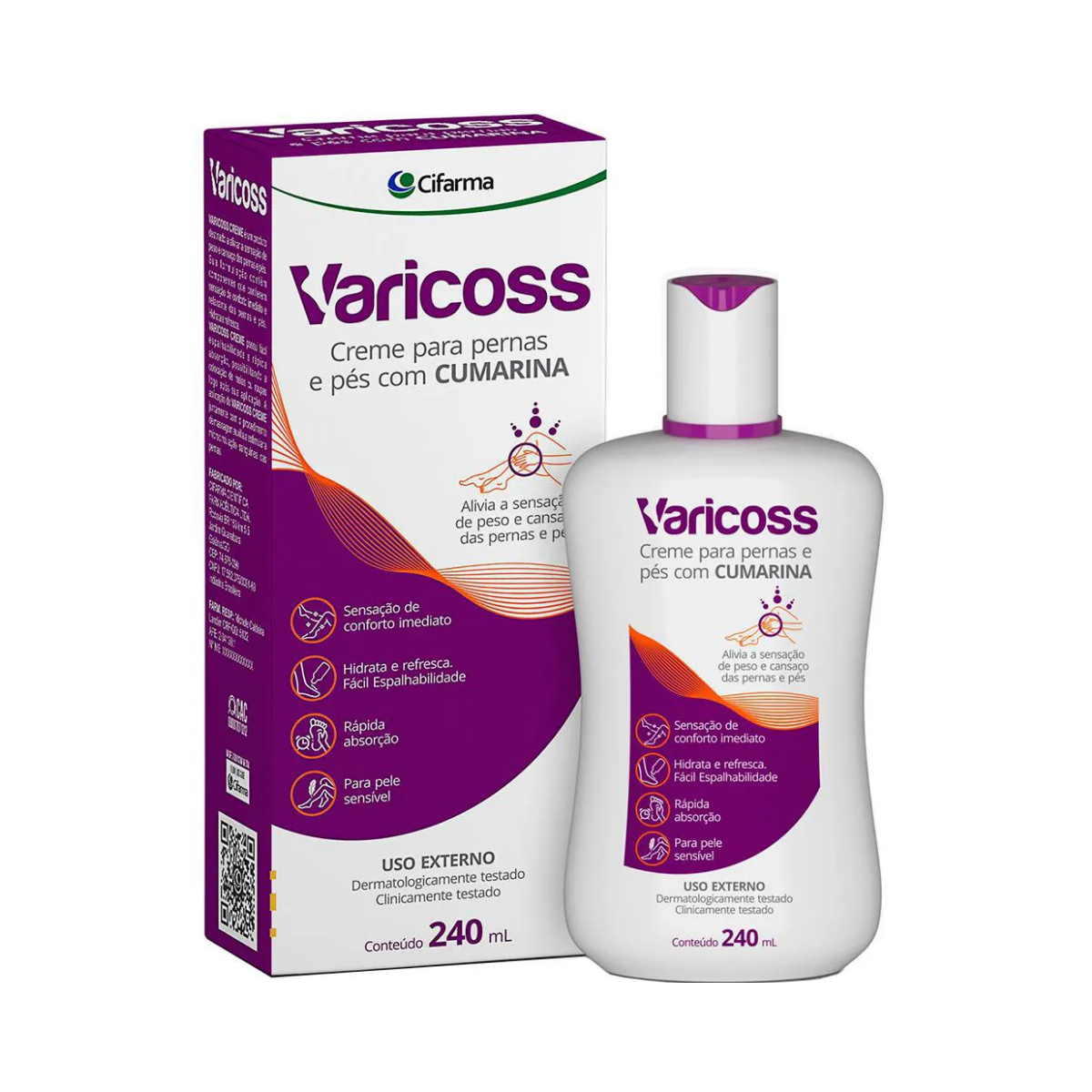 O Creme Para Pernas e Pés Varicoss Cifarma 240ml é um produto cosmético desenvolvido para proporcionar alívio, hidratação e bem-estar para pernas e pés cansados, pesados ou com desconforto. Ele geralmente contém ingredientes com propriedades refrescantes, hidratantes e que auxiliam na circulação local.
