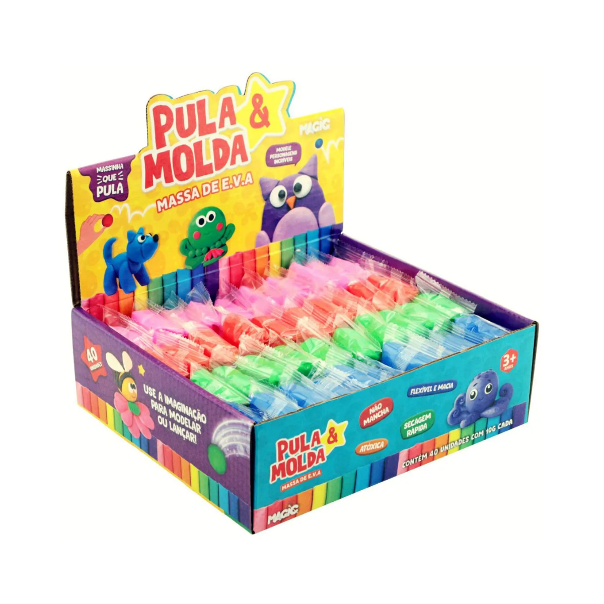 O Display Pula e Molda Magic Kids 10g 40 Unidades é um produto de brinquedo tipo "massinha de modelar" que possui uma característica diferenciada: a capacidade de pular. Ele é projetado para o público infantil, oferecendo uma experiência de brincadeira criativa e interativa.