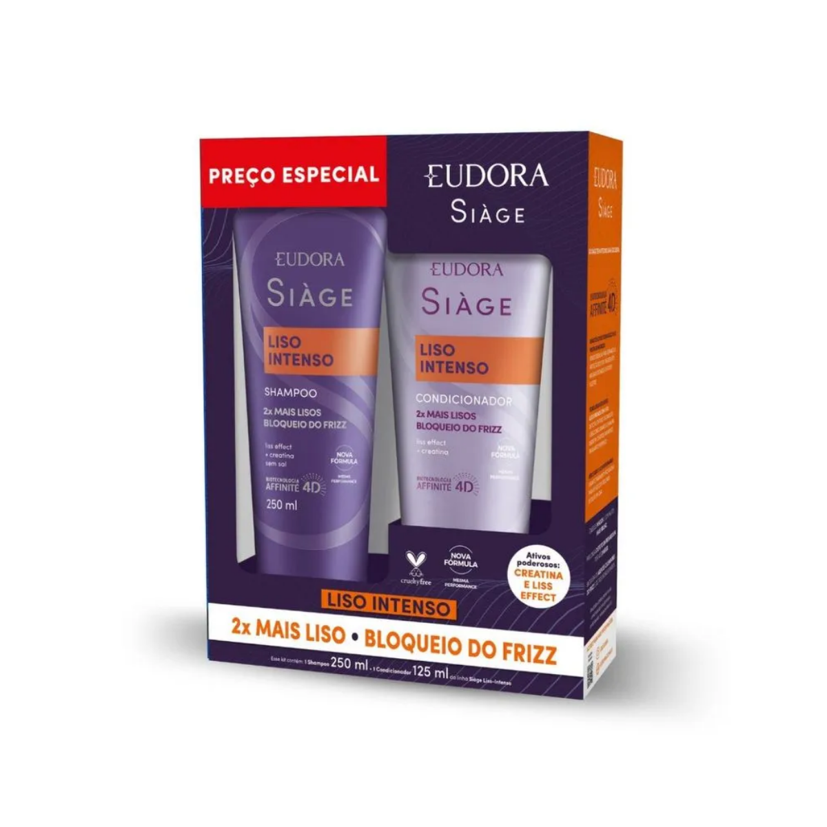 O Combo Siàge Liso Intenso vem com dois itens para limpar e condicionar seus fios, preparando para cuidar dos fios. foi desenvolvido para entregar um liso maravilhoso para seus fios. Sua fórmula inteligente com Creatina e Liss Effect se adapta a lisos naturais, alisados ou com ondas indesejadas, bloqueando os agentes causadores do frizz e de fios indisciplinados. shampoo: O Shampoo Siàge Liso Intenso limpa os fios sem ressecar, entregando cabelos alinhados, disciplinados, brilhantes e com maciez intensa. Sua fórmula com Creatina, aliada ao complexo Liss Effect, garante os cuidados necessários de acordo com cada tipo de fio. condicionador: Com fórmula ultra hidratante, o Condicionador Siàge Liso Intenso deixa os fios hidratados, desembaraçados e com brilho intenso. Seus ativos inteligentes garantem liso prolongado sem química, pontas hidratadas sem pesar os fios, 2x menos volume, frizz controlado e facilidade na escovação, evitando a quebra.