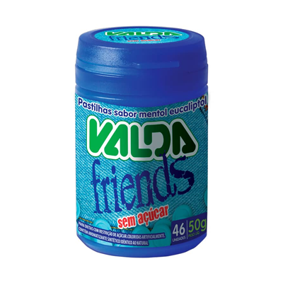 Valda Friends é uma pastilha de compressão com sabor de menta e eucalipto com apenas 2 kcal. Formato redondo que proporciona uma liberação perfeita de sabor, deixando seu hálito muito mais perfumado e sua garganta refrescante, aliando um sabor agradável num produto totalmente sem açúcar.