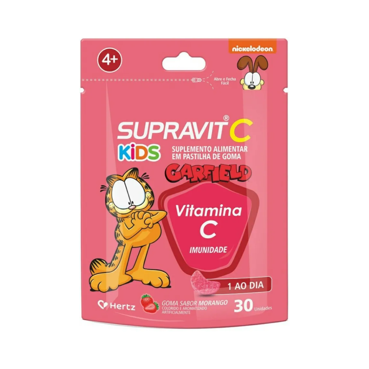 Supravit C Kids Garfield é um suplemento alimentar desenvolvido especialmente para o público infantil, que combina saúde com diversão. Cada goma mastigável contém a dose ideal de vitamina C, um nutriente essencial para o bom funcionamento do organismo. A vitamina C atua no fortalecimento do sistema imunológico, ajudando a proteger o corpo das crianças contra infecções e gripes, o que é essencial para garantir uma infância saudável e cheia de energia. Além disso, essa vitamina desempenha um papel importante na absorção de ferro dos alimentos, prevenindo anemias e garantindo um desenvolvimento adequado. Outro benefício da vitamina C é sua participação no metabolismo de proteínas e gorduras, auxiliando na produção de energia para as atividades diárias.